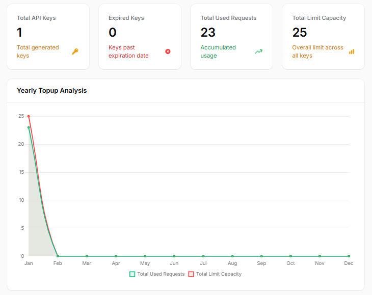 ফুল কন্ট্রোল ড্যাশবোর্ড: আপনার এপিআই কী-র লিমিট কতটুকু আছে এবং কতটুকু ব্যবহার হয়েছে তা রিয়েল-টাইম দেখতে পারবেন।