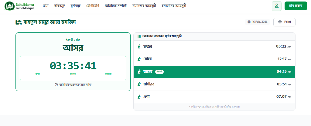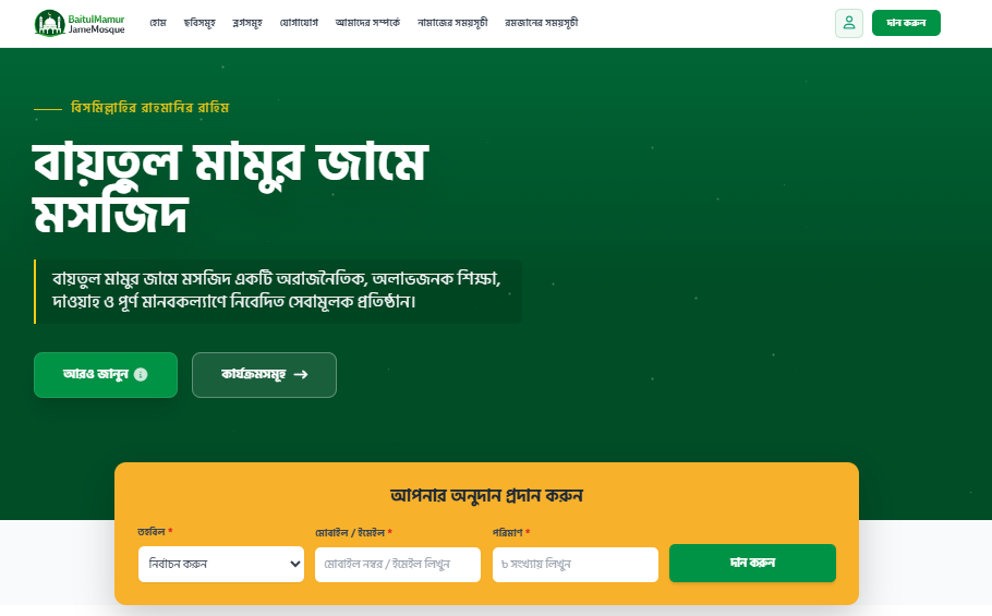 আসসালামু আলাইকুম, ডিজিটাল এই যুগে মসজিদের সাথে মুসল্লিদের যোগাযোগ আরও সহজ করতে আমরা নিয়ে এসেছি একটি আধুনিক ও শরীয়াহ সম্মত ওয়েবসাইট সমাধান। একজন সাধারণ ব্যবহারকারী হিসেবে আপনি এই ওয়েবসাইটে যা যা পাচ্ছেন: