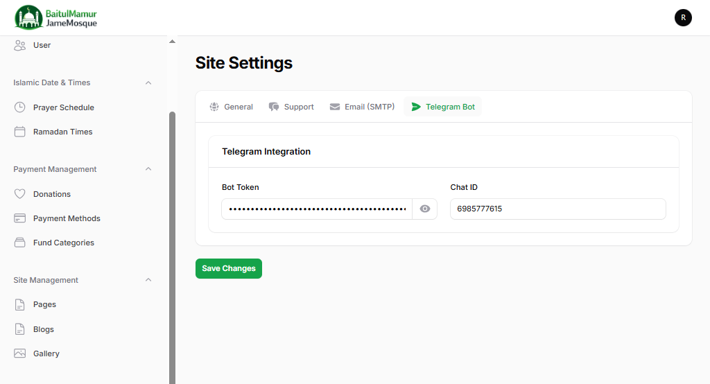 টেলিগ্রাম ইন্টিগ্রেশন: মসজিদের গুরুত্বপূর্ণ আপডেট বা আজানের সংকেত স্বয়ংক্রিয়ভাবে টেলিগ্রাম বটের মাধ্যমে মুসল্লিদের কাছে পৌঁছে দেওয়া।