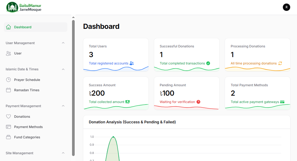 আমানতের স্বচ্ছ হিসাব (Donation Management): কত টাকা দান আসলো, কত পেন্ডিং আর কত সফল—সবকিছুর অটোমেটেড গ্রাফ ও চার্ট রিপোর্ট। এতে হিসাবের গড়মিল হওয়ার সুযোগ নেই।
