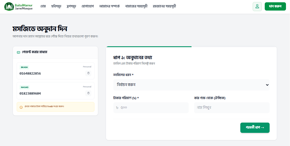 স্বচ্ছ ডোনেশন সিস্টেম: আপনার দান সরাসরি মসজিদের ফান্ডে পৌঁছাবে। আপনি আপনার ডোনেশন হিস্ট্রি নিজেই চেক করতে পারবেন, যা সততা ও স্বচ্ছতা নিশ্চিত করে।