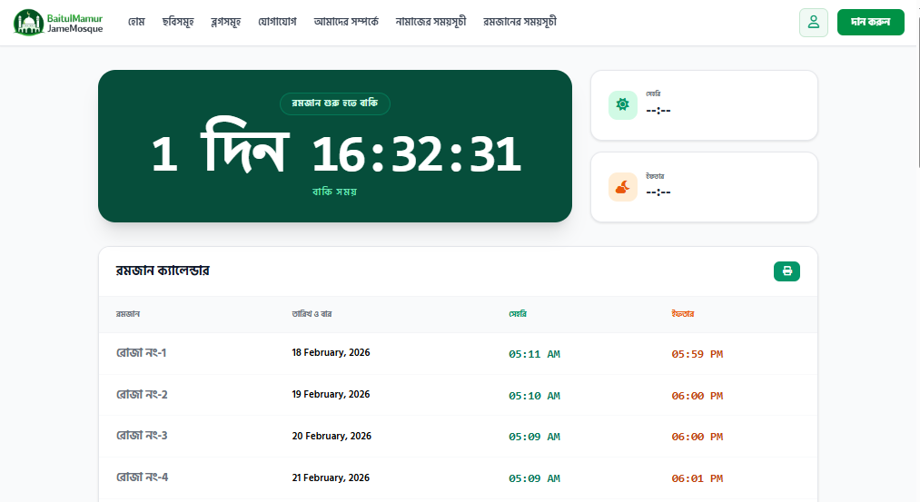 নির্ভুল রমজান ও নামাজের সময়সূচী: এলাকাভিত্তিক সেহরি ও ইফতারের সঠিক সময় এবং জামায়াতের আপডেট।