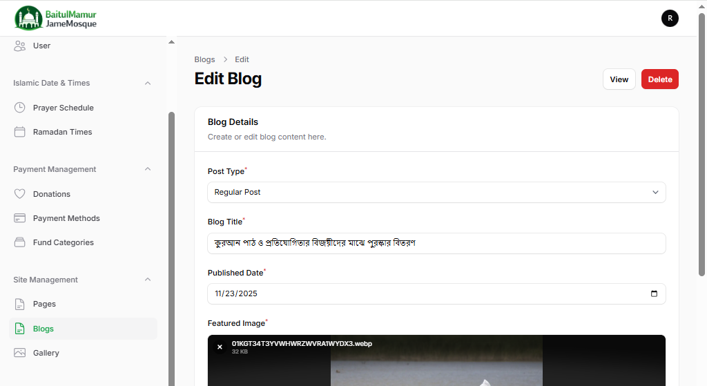 সহজ কন্টেন্ট ম্যানেজমেন্ট: কোনো কোডিং জ্ঞান ছাড়াই মসজিদের নামাজের সময় পরিবর্তন, ব্লগ পোস্ট বা গ্যালারিতে ছবি আপলোড করার সুবিধা।