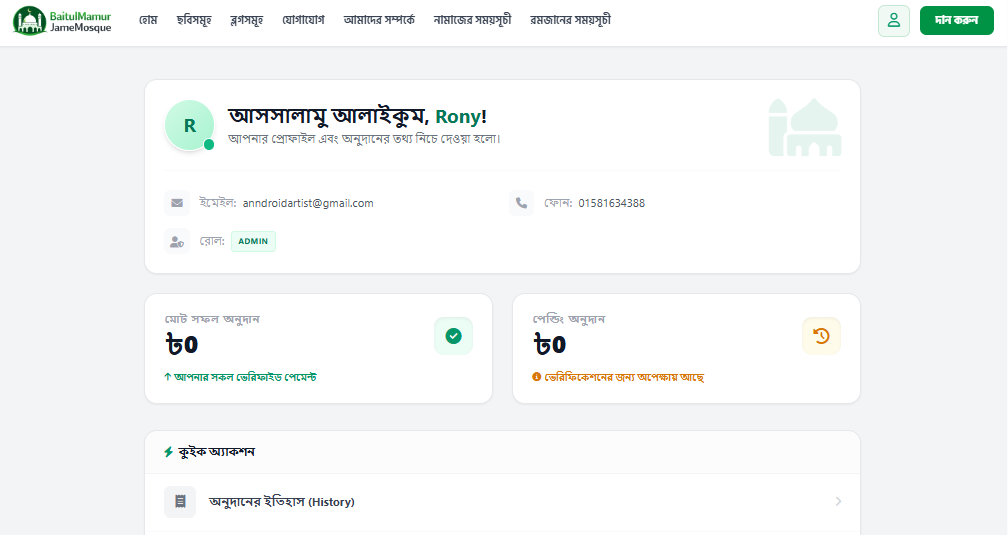 ব্যক্তিগত প্রোফাইল: নিজের দানের হিসাব এবং মসজিদের সাথে সম্পৃক্ততার তথ্য ব্যক্তিগত ড্যাশবোর্ডে সংরক্ষিত থাকবে।