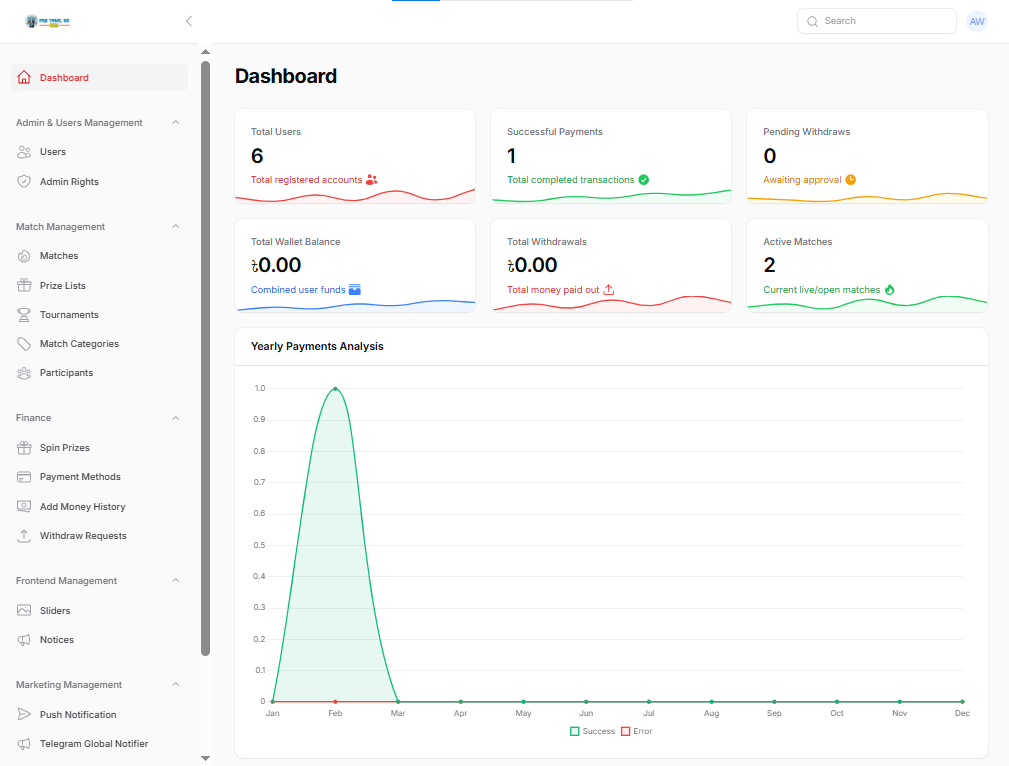 ড্যাশবোর্ড: রিয়েল-টাইম গ্রাফের মাধ্যমে বাৎসরিক টপ-আপ এবং উইথড্রালের পরিসংখ্যান দেখা যায়। . স্মার্ট সেটিংস ম্যানেজমেন্ট: সাইটের লোগো, ফেভিকন এবং থিম কালার সরাসরি প্যানেল থেকে পরিবর্তন করা সম্ভব।