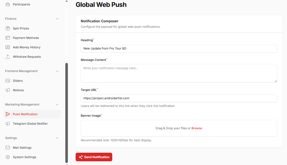 টেলিগ্রাম বট ইন্টিগ্রেশন: প্রতিটি টপ-আপ বা উইথড্র রিকোয়েস্ট আসার সাথে সাথে অ্যাডমিনের টেলিগ্রামে অটোমেটিক নোটিফিকেশন চলে যায়। বট টোকেনটি সেভ করার সময় সিস্টেমটি স্বয়ংক্রিয়ভাবে চেক করে টোকেনটি সঠিক কি না। . উইথড্রাল ম্যানেজমেন্ট: অ্যাডমিন যেকোনো উইথড্র রিকোয়েস্ট এপ্রুভ করতে পারেন অথবা রিজেক্ট করে সরাসরি ইউজারের অ্যাকাউন্টে টাকা রিফান্ড করে দিতে পারেন।