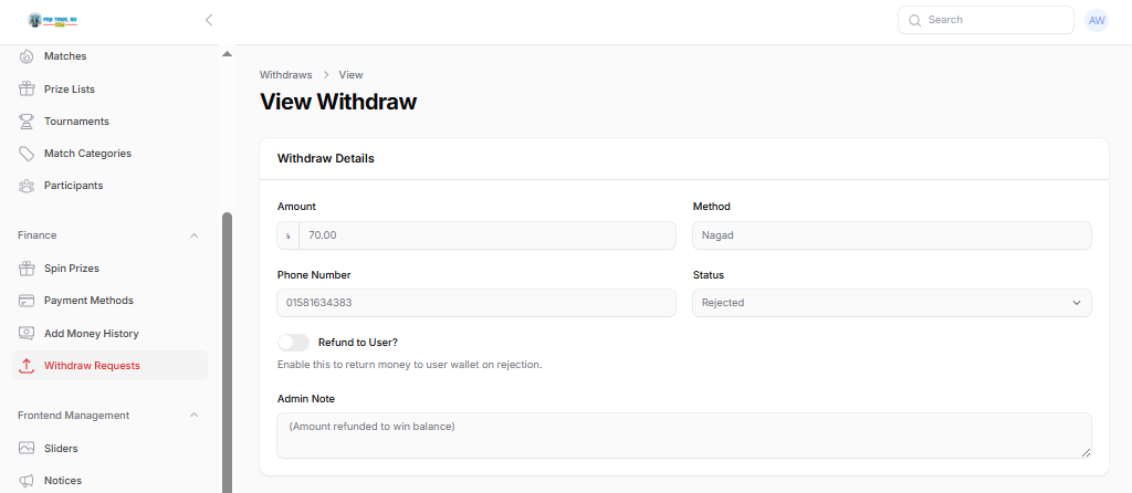 স্মার্ট রিফান্ড সিস্টেম: উইথড্রাল রিজেক্ট হলে কোনো ঝামেলা ছাড়াই টাকা ইউজারের ব্যালেন্সে ফিরে আসে।